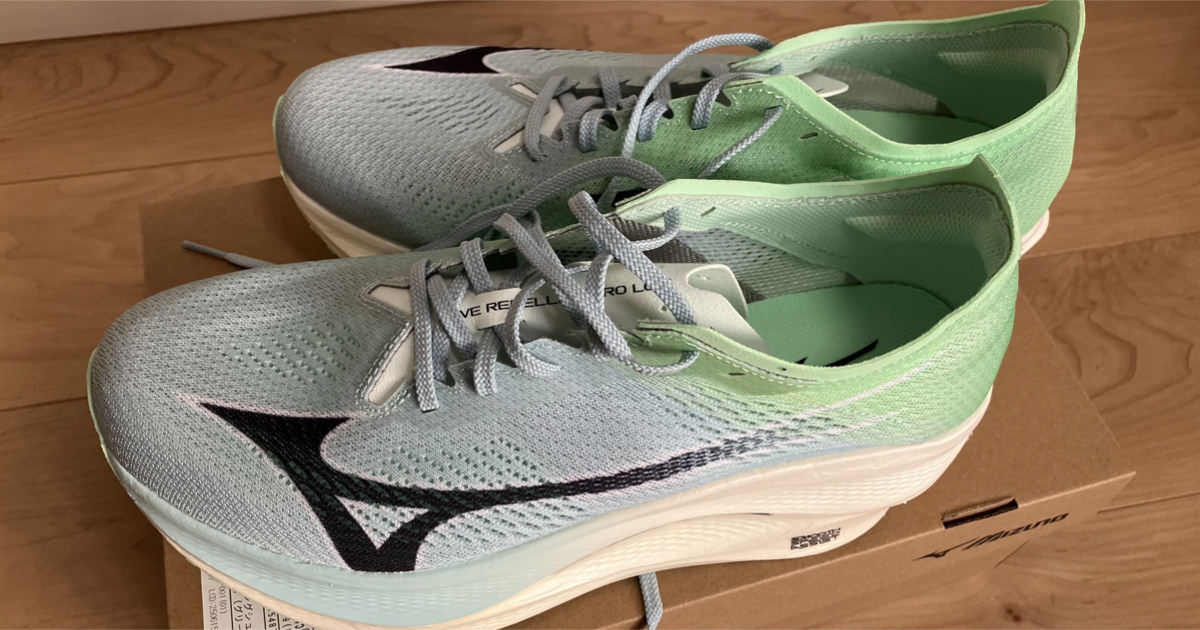 今シーズンのレースシューズにしているミズノのウェーブリベリオンプロローですが、イベントで試し履きして走って合うなと感じただけでなく、優しいブルーとグリーンの色合いも好きで買いました。レースの時にこれを履くと落ち着いた気持ちになれます。